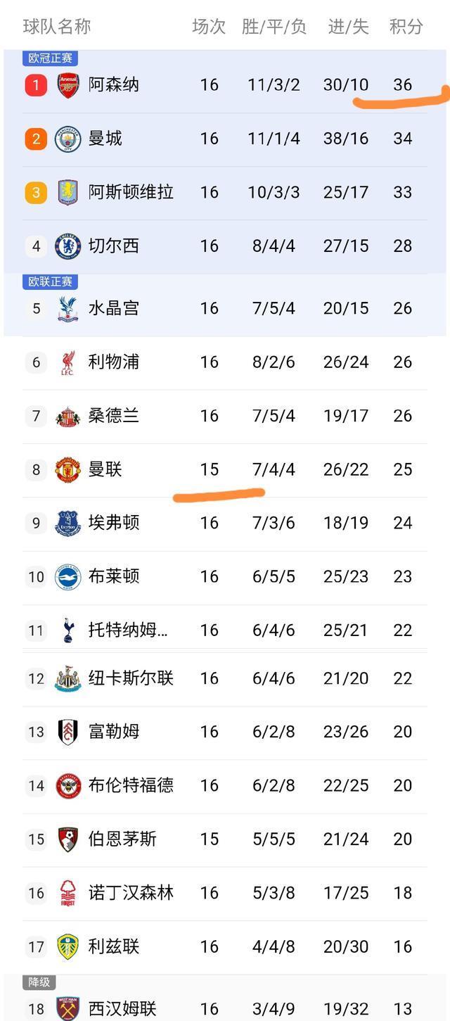 可以看到除了曼联和伯恩茅斯没有踢完第16轮之外,其他球队都已经踢完了第16轮的比赛。阿森纳依然领跑,依然领先曼城2分,曼城紧追阿森纳,阿森纳感受巨大压力。当然除了曼城之外,维拉也是保持强势,本轮再次取得胜利之后,维拉继续保持争冠的势头,可以说阿森纳、曼城、维拉都是加大马力全速前进啊。